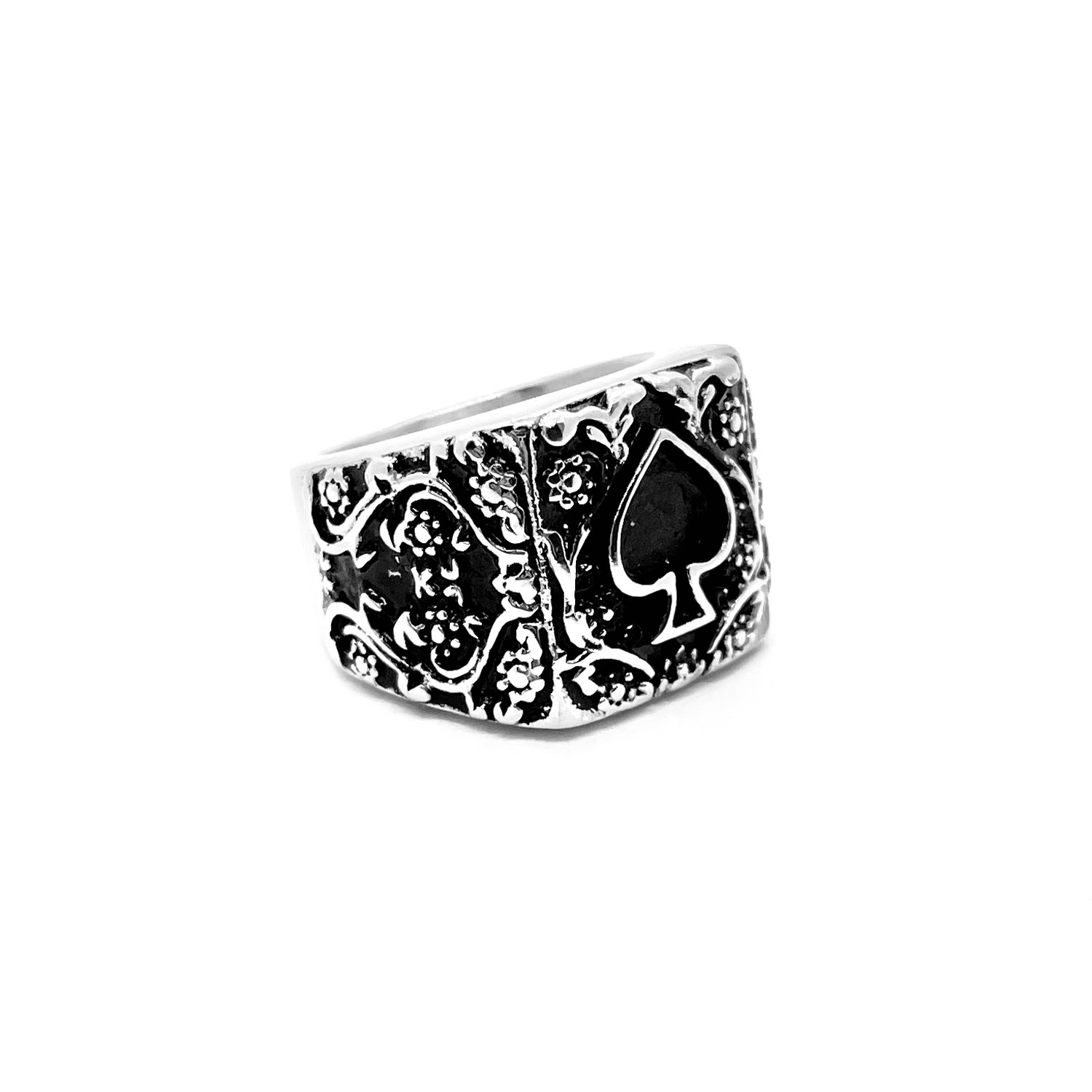 Anillo de corazón de pica con detalles alrededor, perfecto para ocasiones casuales y formales, combinable con cualquier otro diseño de anillo, de color plateado, material acero inoxidable 316L de grado quirúrgico.