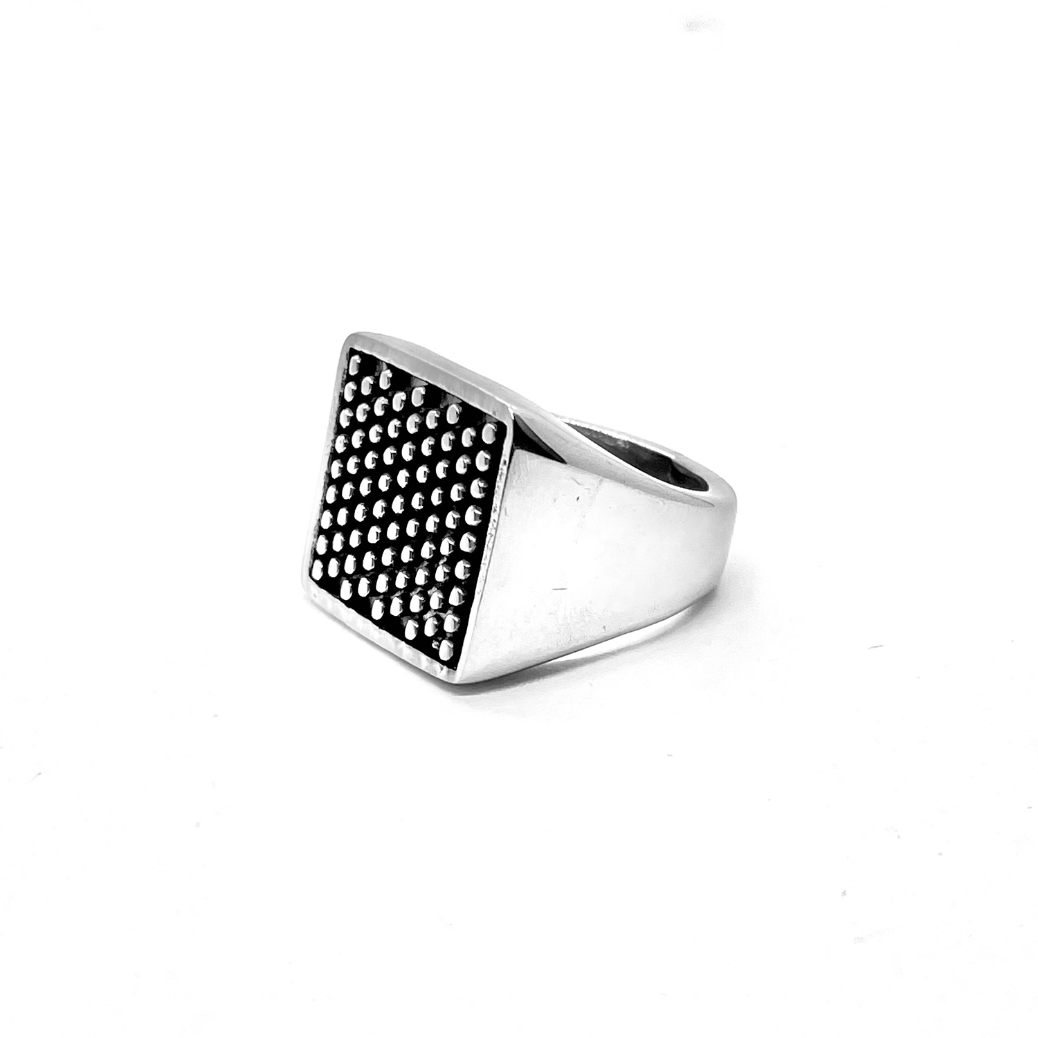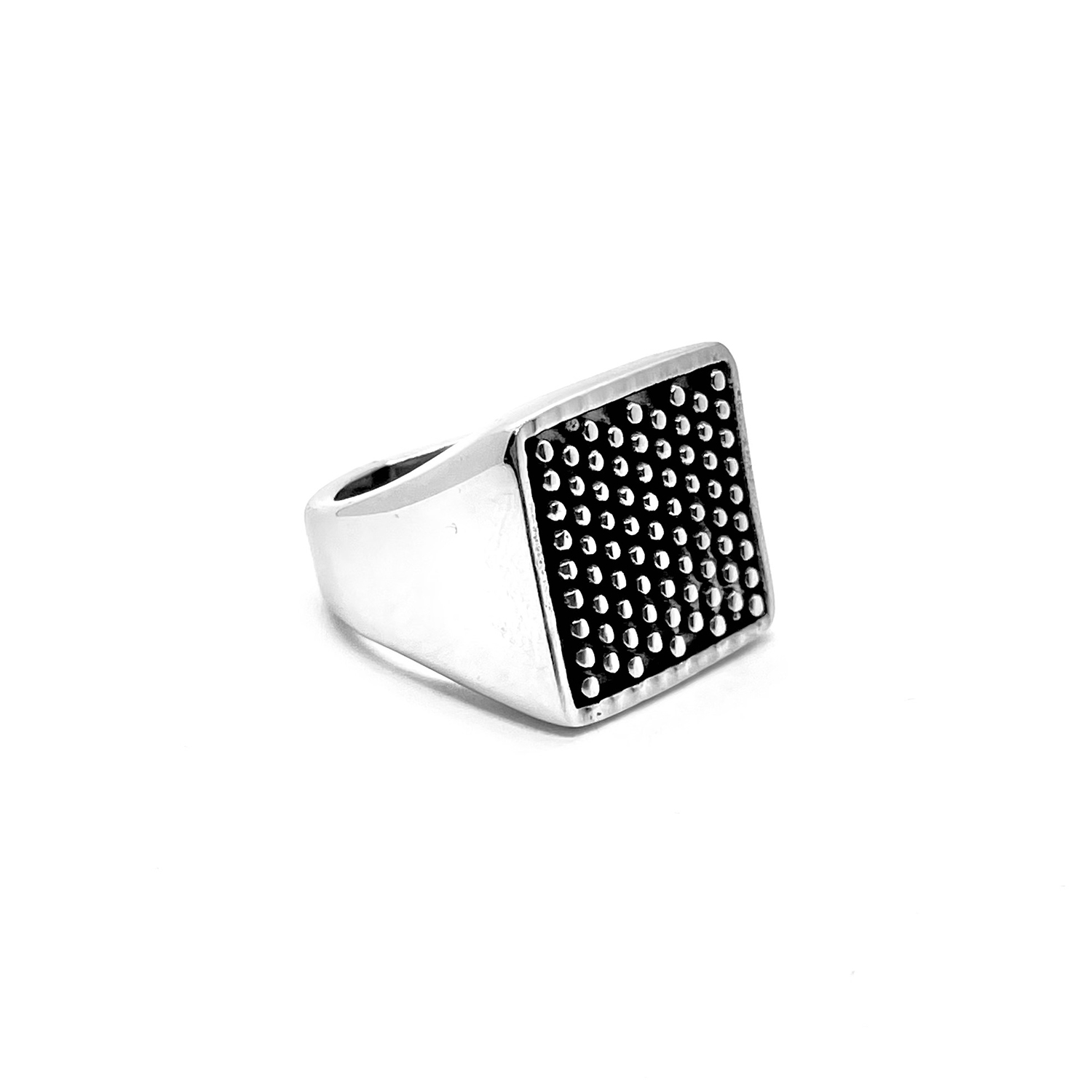 Anillo cuadrado con puntos incrustados en su diseño de color plateado, material acero inoxidable 316L de grado quirúrgico.
