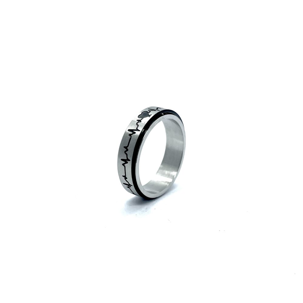 Pieza minimalista y giratorio en color plateado con diseño de latido de corazon. El material es acero inoxidable 316L de grado quirúrgico, resistente a caídas, agua, alcohol, etc.