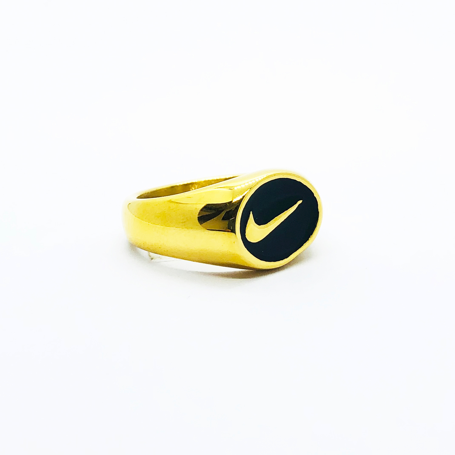 Anillo Swoosh I, un diseño minimalista en tamaño pequeño en formato plano con un una forma ovalada, de color dorado, material acero inoxidable 316L de grado quirurgico, resistente a caidas, agua, alcohol, etc