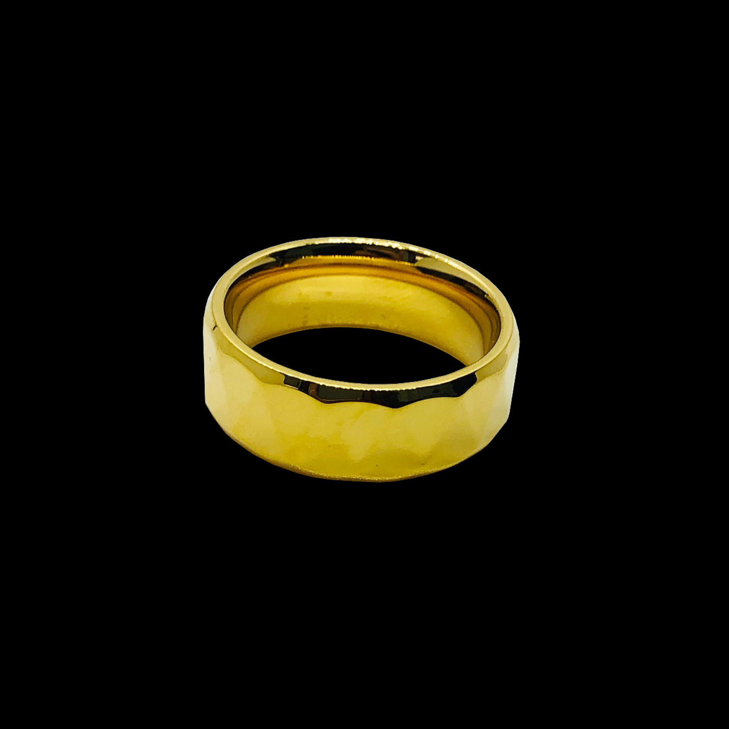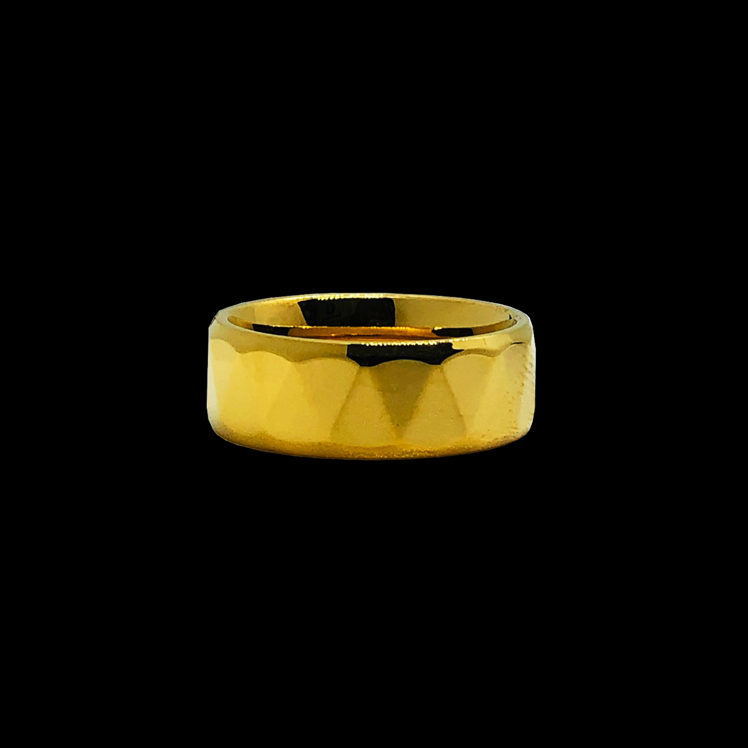 Anillo minimalista con detalles de triangulos por todo su diseño, de color dorado, material acero inoxidable 316L de grado quirurgico.